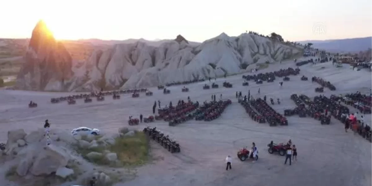 Onlarca ATV motorla gezinti yapan konuklar, Göreme beldesindeki Güllüdere Vadisi girişinde turu tamamlıyor.